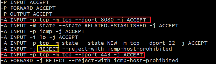 위 사진을 보면 8080포트와 443 포트가 ACCEPT 되어있는 것을 확인할 수 있습니다.