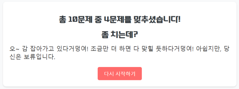 하나의 퀴즈에 10문제를 만들었습니다. 10문제를 풀고 나면 총 몇 문제를 맞혔는지 알려줍니다 ㅎㅎ