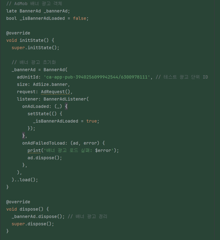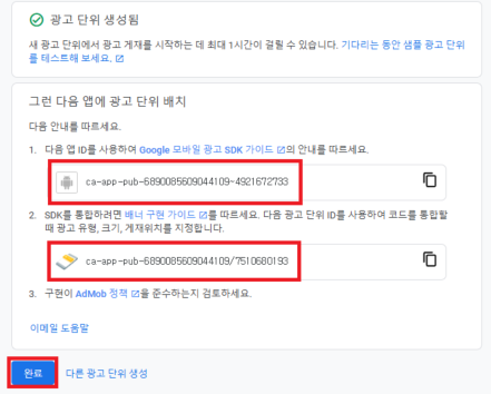 - 확인해보니 Admob에서 제공하는 테스트 ID가 있다고 해서 그걸로 진행했습니다.