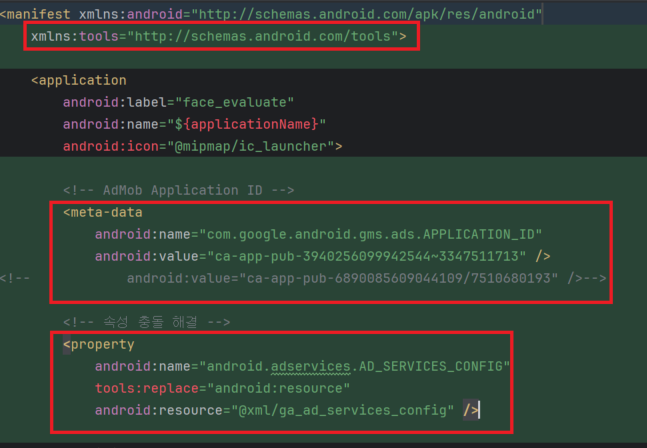 - 광고단위ID를 복사해서 AndroidManifest.xml파일에 넣으면되는데 저는 앱스토어에드등록된 것이 아니라서 그런지 오류가 발생했었습니다.