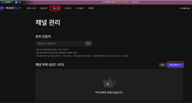 - 회원가입 완료되면 상단에 '채널 관리 클릭'