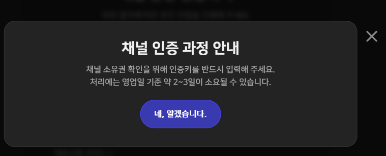 - 채널 인증하는데 2~3일 소요된다고 하네요.