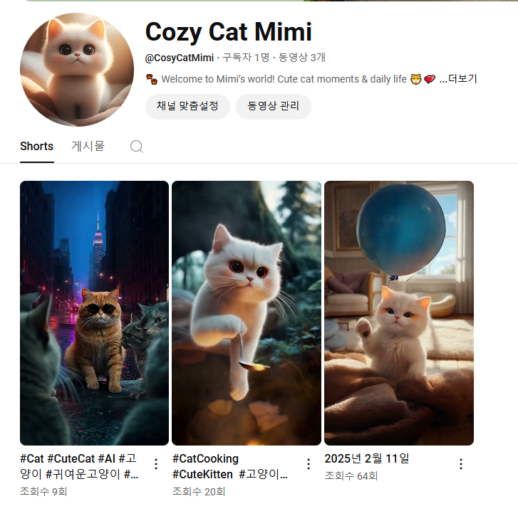 - Cosy Cat 이라는 채널을 만들어서 AI로 영상 만들어보고 있습니다.. ㅋㅋ