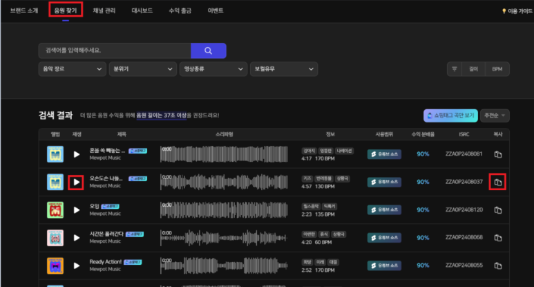 - 상단의 '음원 찾기'를 클릭하면 여러 음원 목록이 나오는데 원하시는 음원의 'ISRC'값을 복사합니다.