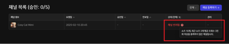 - 며칠 뒤에 확인해 보니 채널 승인이 반려당했습니다. ㅋ_ㅋ