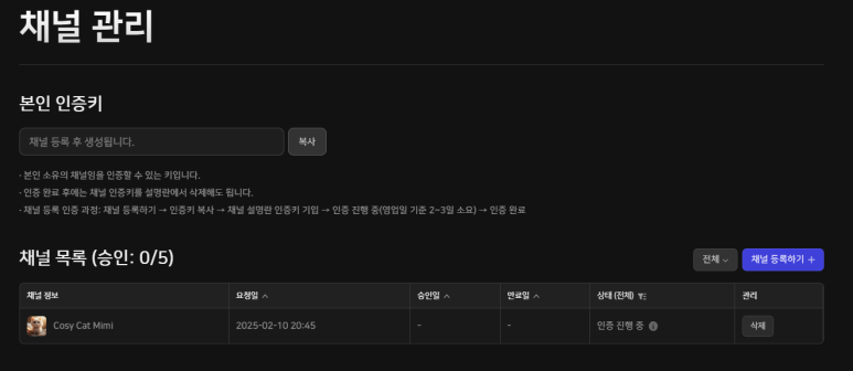 - 채널 승인 목록에 '인증 진행 중'이라고 나옵니다.