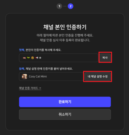 - 채널 본인 인증을 위해 첫 번째 인증키를 복사합니다.