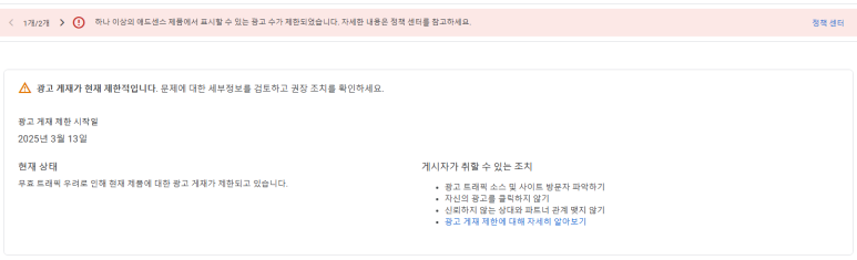 애드센스 사이트에서 확인해 보니 광고가 제한되었다고 나오네요..