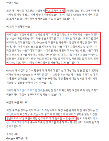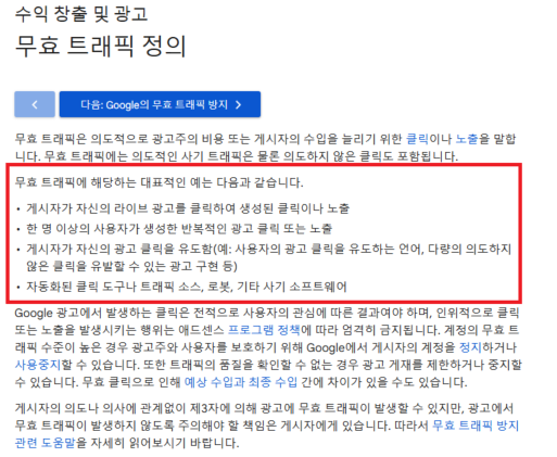 구글 애드센스에서 말하는 무효 트래픽의 정의는 아래와 같습니다.
