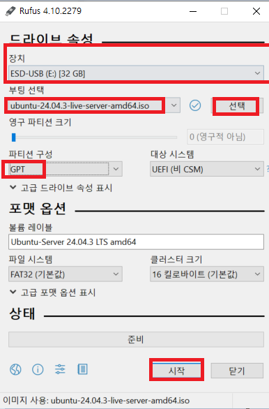 - 부팅선택: ISO파일, 선택 버튼으로 iso파일 지정
