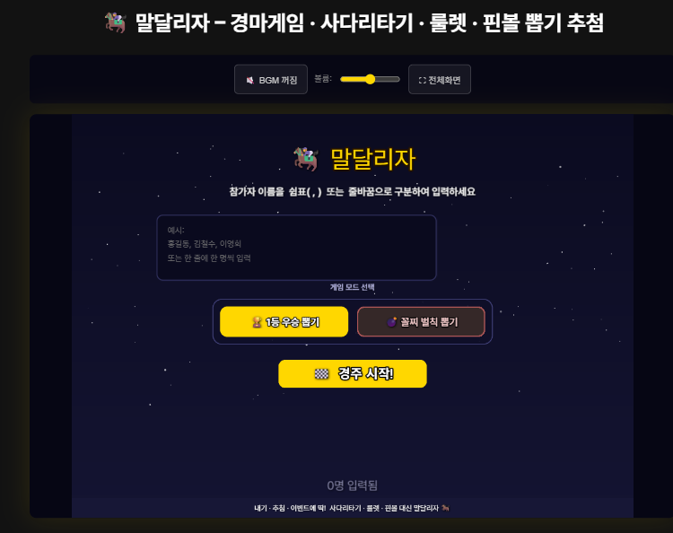 이름을 입력하고 경주를 시작하면 말들의 등급이 랜덤으로 정해집니다. 대부분은 평범한 말(🏇)이지만, 운이 좋으면 반짝이는 레어 말(🦄)이나 불타는 에픽 말(🐉)이 걸립니다. 등급이 높으면 속도도 빠르고 부스터도 잘 터져서 시작부터 환호성(혹은 야유)이 터져 나옵니다.