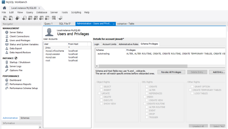 cmd에서 명령어를 사용하지 않고 여기서도 사용자 생성 및 권한설정도 가능하다.