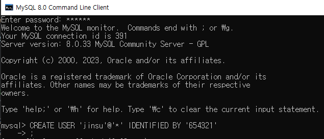 CREATE USER '사용자명'@'호스트' IDENTIFIED BY '비밀번호';