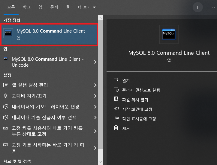 먼저 MySQL command line client를 클릭하여 cmd 창을 띄운다.