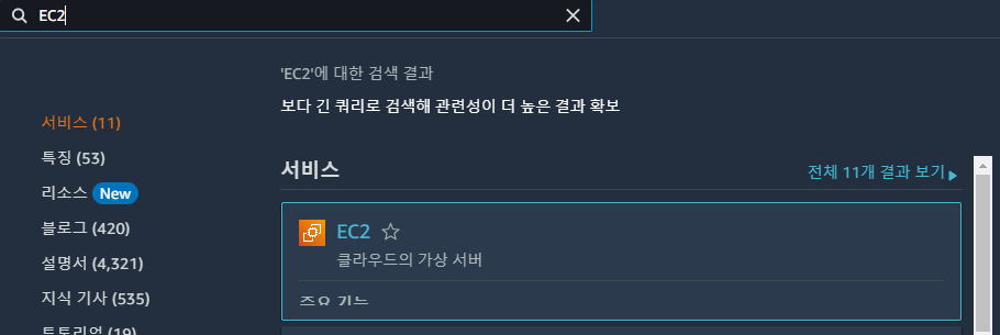 - 아마존 홈페이지 검색창에 EC2를 검색하고 클릭한다.