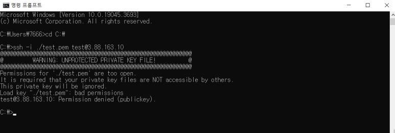 - 아래는 접속에 성공하기 전에 Permission denied 라는 에러가 나면서 실패했다. 검색해서 하라는대로 아무리해봐도 넘어가질 않았다. 그래서 이전 포스팅에서 했던 인스턴스와 키페어를 새로 생성하였더니 된다. 3시간 삽질했는데 참아야지..