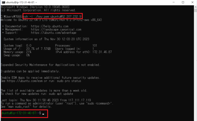 - ssh -i ./"키페어파일명칭.pem" ubuntu@본인 퍼블릭IPv4주소