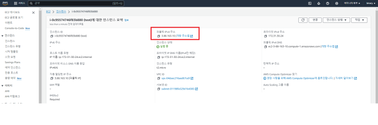 - 클릭하면 상세정보가 나오며 여기서는 퍼블릭IPv4주소가 필요하다.