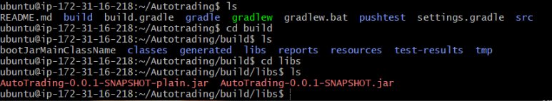 - 빌드가 완료된 이후 ls 명령어로 확인해보면 프로젝트명-0.0.1-SNAPSHOT.jar 파일이 생긴다.