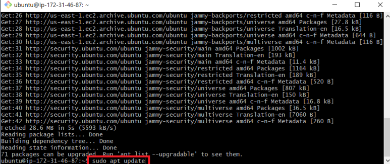 - sudo apt update 명령어를 날려서 패키지 매니저가 관리하는 패키지의 정보를 최신 상태로 업데이트한다.