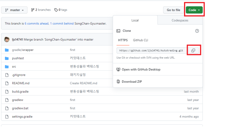 - git clone을 하기 위해 깃허브에 등록되어있는 주소를 복사한다.