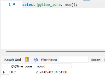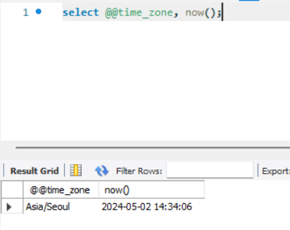 먼저 DB에 접속해서 아래 명령어를 입력하여 time_zone과 현재 시간을 확인합니다.