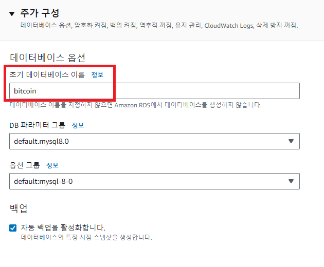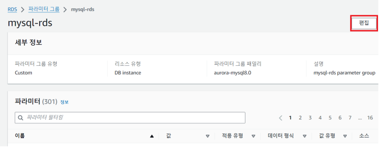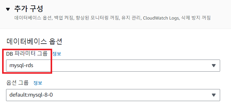 추가 구성에 DB 파라미터 그룹을 변경하고 저장합니다.