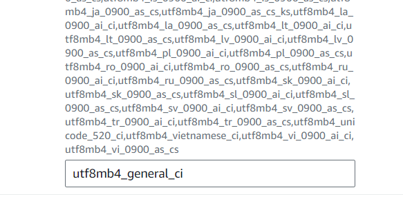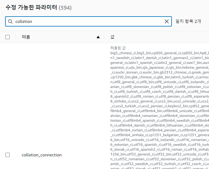 collation을 검색해서 값에다가 'utf8mb4_general_ci'를 입력하고 [저장] 버튼 클합니다.