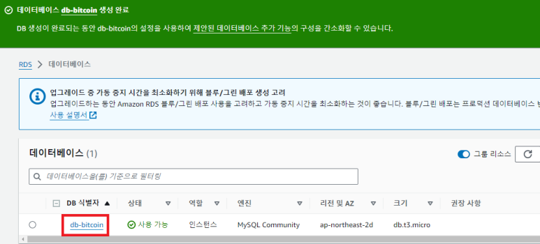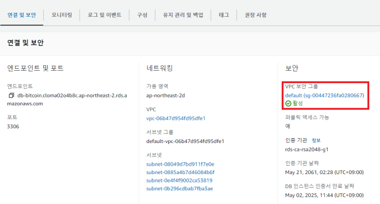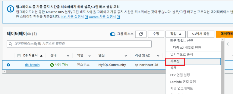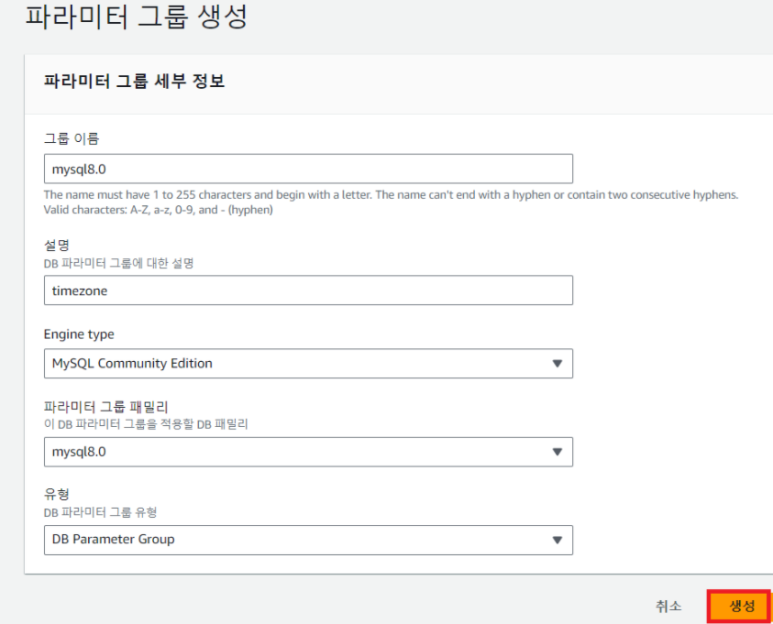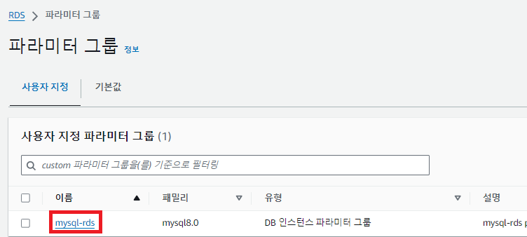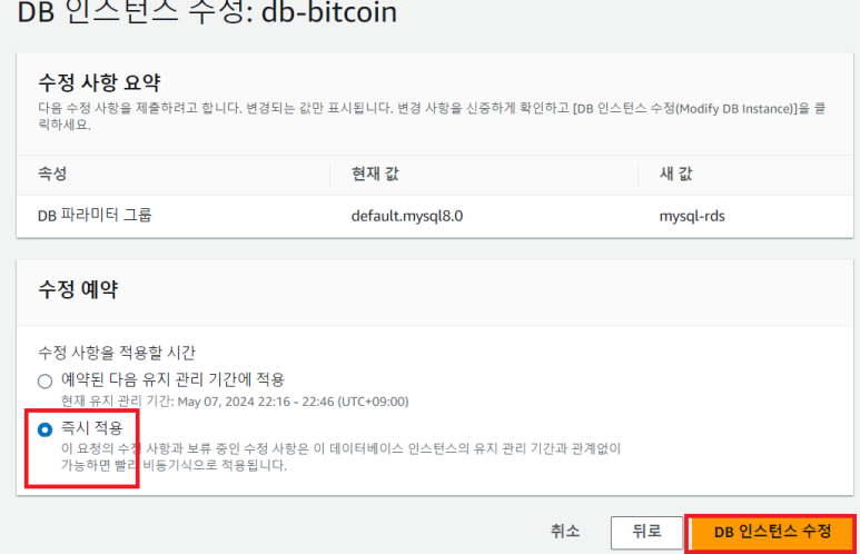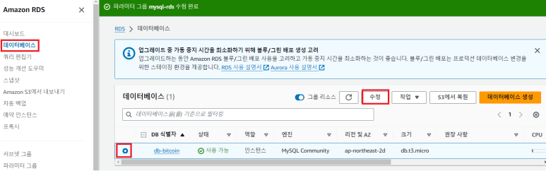 DB에 방금 설정한 파라미터 그룹을 적용합니다.