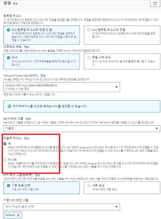 퍼블릭 액세스만 "예" 하고 나머지는 기본설정으로 했습니다.