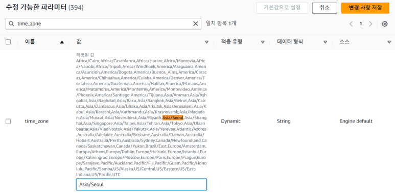 character_set을 검색해서 값에다가 'Aisa/Seoul'를 입력하고 [저장] 버튼 클합니다.