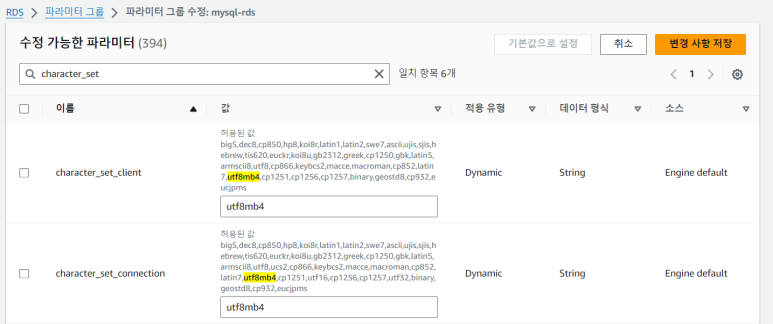 character_set을 검색해서 값에다가 'utf8mb4'를 입력하고 [저장] 버튼 클합니다.