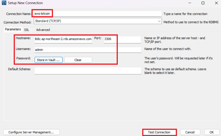 Hostname에는 아까 생성한 DB 인스턴스 정보에 있는 엔드포인트를 적어주시면 됩니다.