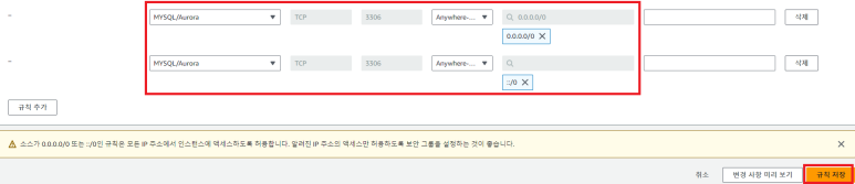 MySQL 3306포트에 IPv4, IPv6 열어주고 저장합니다.