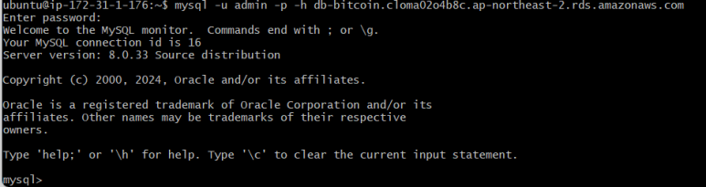 mysql -u 사용자명 -p -h RDS엔드포인트주소