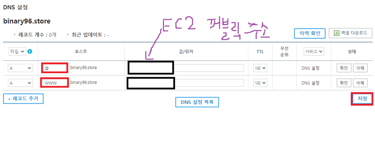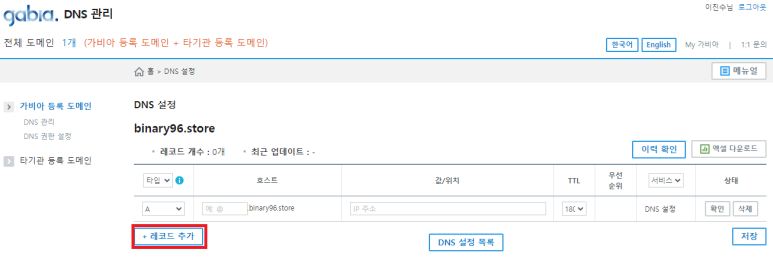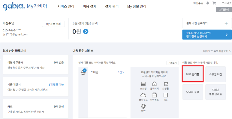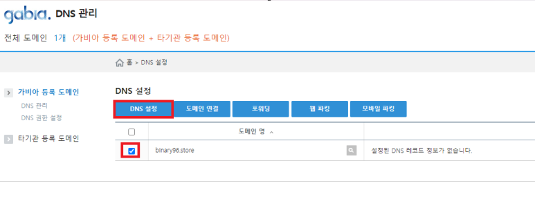 본인 도메인 체크박스 클릭 후 DNS 설정 클릭
