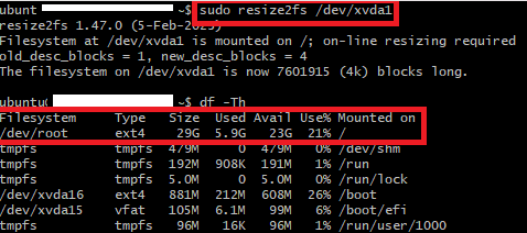 - 이후 df -Th 명령어로 확인해 보면 전체 용량이 8GB -> 30G 변경된 것을 확인할 수 있습니다.