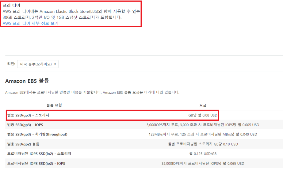 - 수정하기 전에 EBS 요금 문서를 보면 아래처럼 프리티어에서 30GB 스토리지를 사용할 수 있다고 되어있습니다. 그리고 GB당 월 0.08 USD라고 합니다.