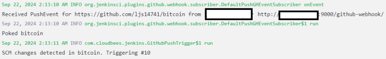 - 젠킨스 로그를 보면 깃허브에 푸시 이후에 자동으로 빌드가 돌아가고 있음을 확인할 수 있습니다.