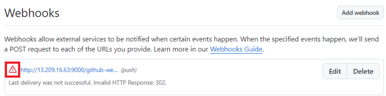 - Github에 Webhooks를 확인해 보니 302에러가 발생했습니다.