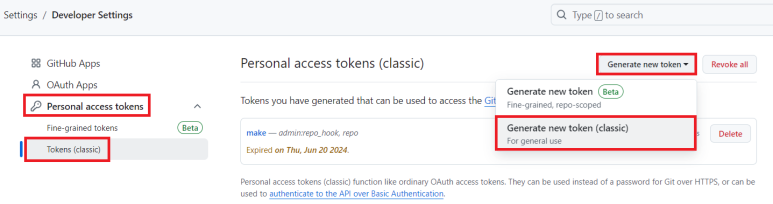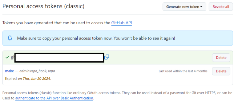 - 한번 생성한 토큰은 다시 볼 수 없으므로 저장해둬야 합니다.