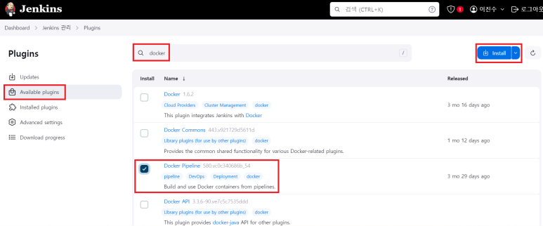 - Availablu plugins 메뉴에서 docker 검색 후 Docker Pipline 설치