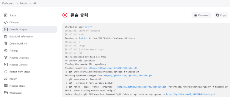 - 빌드번호를 클릭하고 Console Output에서 확인해 보면 왜 에러가 났는지 확인할 수 있습니다.