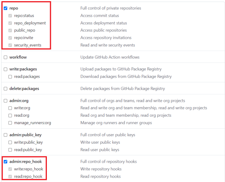 - admin:repo_hook: 저장소의 webhook 관리할 수 있게 합니다. 이는 Jenkins가 GitHub 저장소에 webhook 자동으로 추가하거나 수정할 때 필요할 수 있습니다.