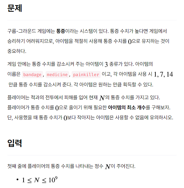 소스코드 import java.io.*; class Main { public static void main(String[] args) throws Exception { BufferedReader br = new BufferedReader(new InputStreamReader(System.in)); int num = Integer.parseInt(br.readLine()); int answer = 0; if(num>13) { answer = answer + num/14; num = num%14; if(num>6) { answer = answer + num/7; num = num%7; if(num>0) { answer = answer + num; } } else { answer = answer + num;..